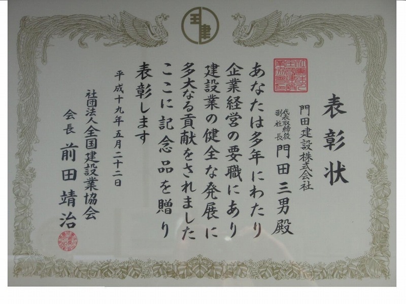 社団法人 全国建設業協会より、当社の代表取締役会長 門田 三男が多年にわたり役員の要職にあり かつ建設業の健全な発展の為に尽力しその功績が認められ表彰を受けました。