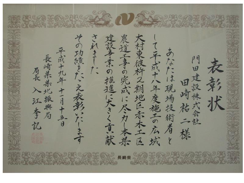 長崎県県北振興局 局長様より表彰を受けました。 2025年7月4日2007年11月26日 by kadota_admin 平成18年度施工“広域大村東彼杵2期地区赤木工区農道工事”の優秀現場代理人として当社の田崎祐二が表彰を受けました。