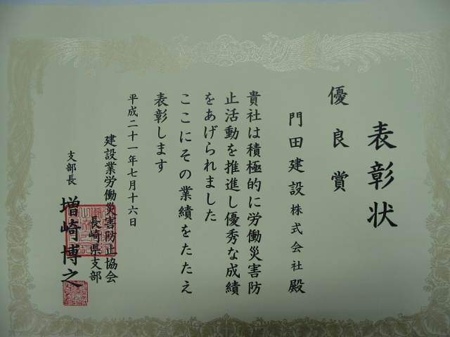 建設業労働災害防止協会長崎県支部より表彰を受けました。 2025年7月10日2009年7月22日 by kadota_admin 労働安全衛生の推進及び無災害の為、建設業労働災害防止協会 長崎県支部長様より表彰を受けました。