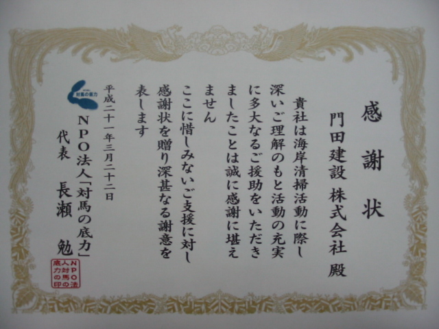 NPO法人「対馬の底力」より感謝状を頂きました。 2025年7月5日2009年7月22日 by kadota_admin 厳原町阿連 白浜海岸の清掃活動実施と今後のNPO活動の支援としてトン袋を寄贈し感謝状を頂きました。とが出来、落成式にて感謝状を頂きました。