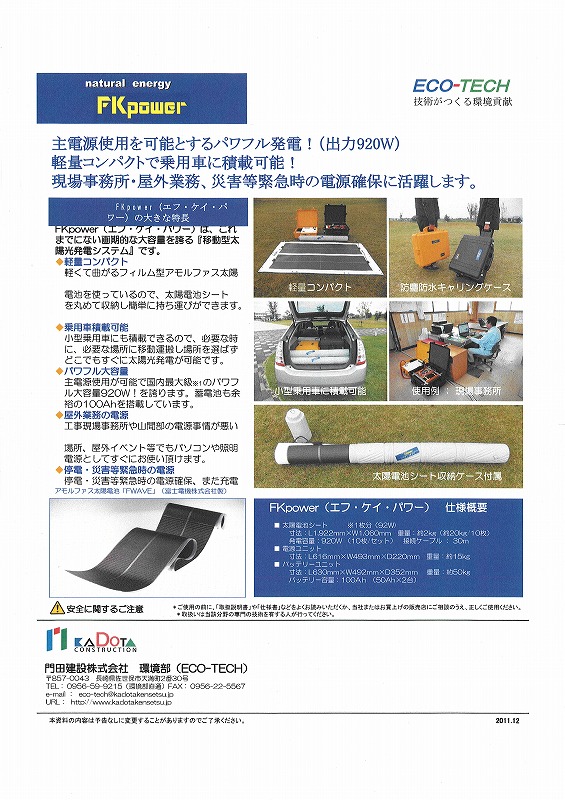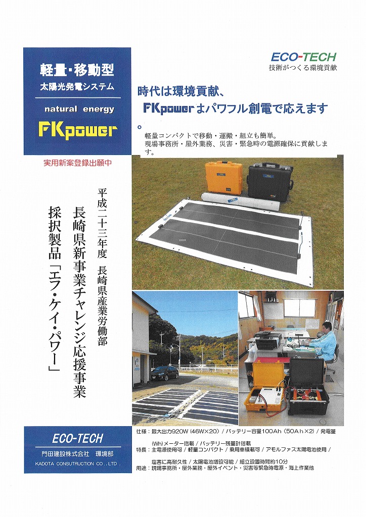 移動型太陽光発電システム「FKpower」発売開始 2025年7月10日2011年12月13日 by kadota_admin 平成23年度 長崎県産業労働部「長崎県新事業チャレンジ応援事業」に採択されました。 連絡先 : (0956)59-9215 担当者 : 仁位