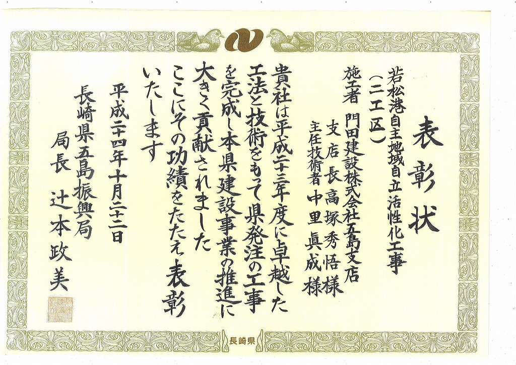長崎県五島振興局より表彰を受けました。 2025年7月10日2012年10月22日 by kadota_admin H23年度施工 若松港自主地域自立活性化工事(二工区)において、長崎県五島振興局より表彰を受けました。