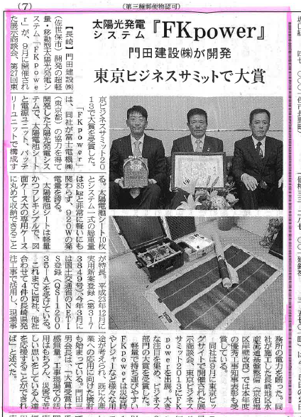 『九建日報』にFKpowerが掲載されました! 2025年7月10日2013年10月8日 by kadota_admin 10/8付『九建日報』にFKpower東京ビジネスサミット大賞受賞について、掲載されました! FKpowerの仕様や、実際に使用した現場が優秀工事知事表彰を受賞したことなどが載っております。